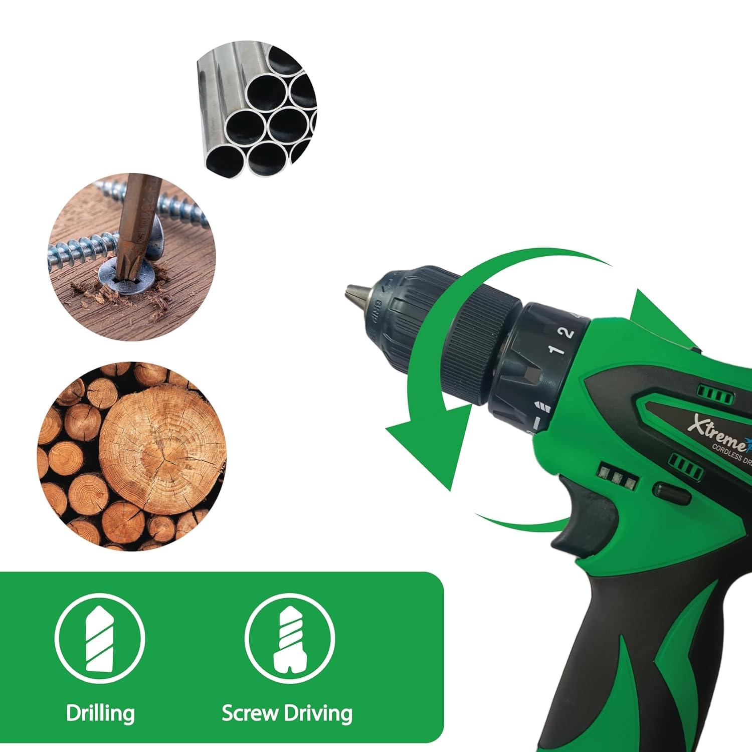 • 【18+1 Clutch, 2-Variable Speed& 350In-lb Torque】Equipped with 2 in 1 working mode – driving and drilling Xtremefast 12V Drill/Driver is your good partner to work around. 18 adjustable clutch settings with variable pressure trigger (2-speed: 0-350RPM,0-1350RPM) help complete a wide range of applications precisely.